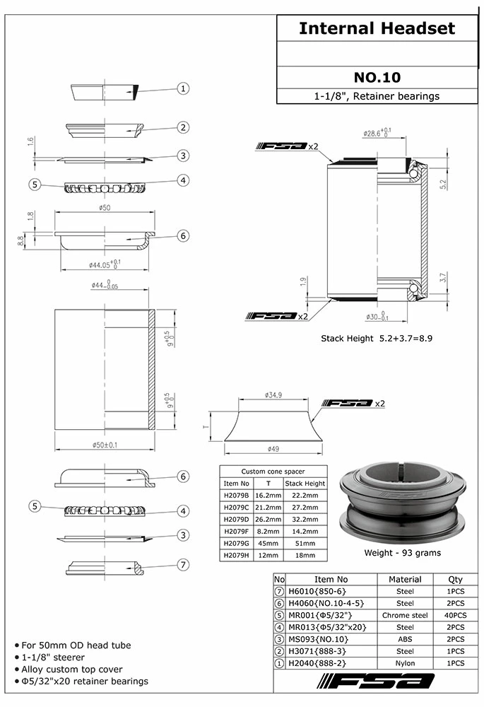 Caractéristiques du produit – Jeu de direction FSA NO.10