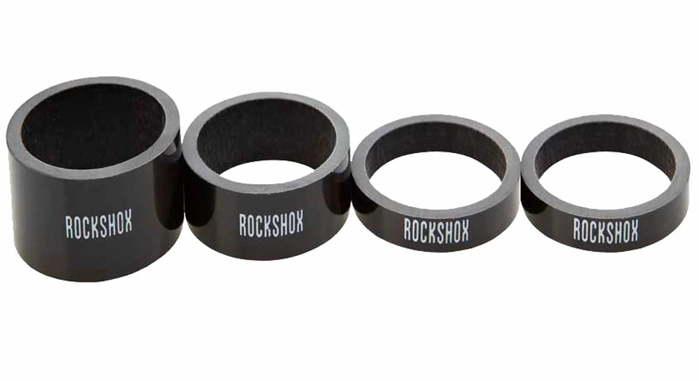 Set d’entretoises en carbone 1 1/8″ avec tirette Rock Shox en trois tailles différentes – 2 x 5 mm, 1 x 10 mm et 1 x 15 mm.