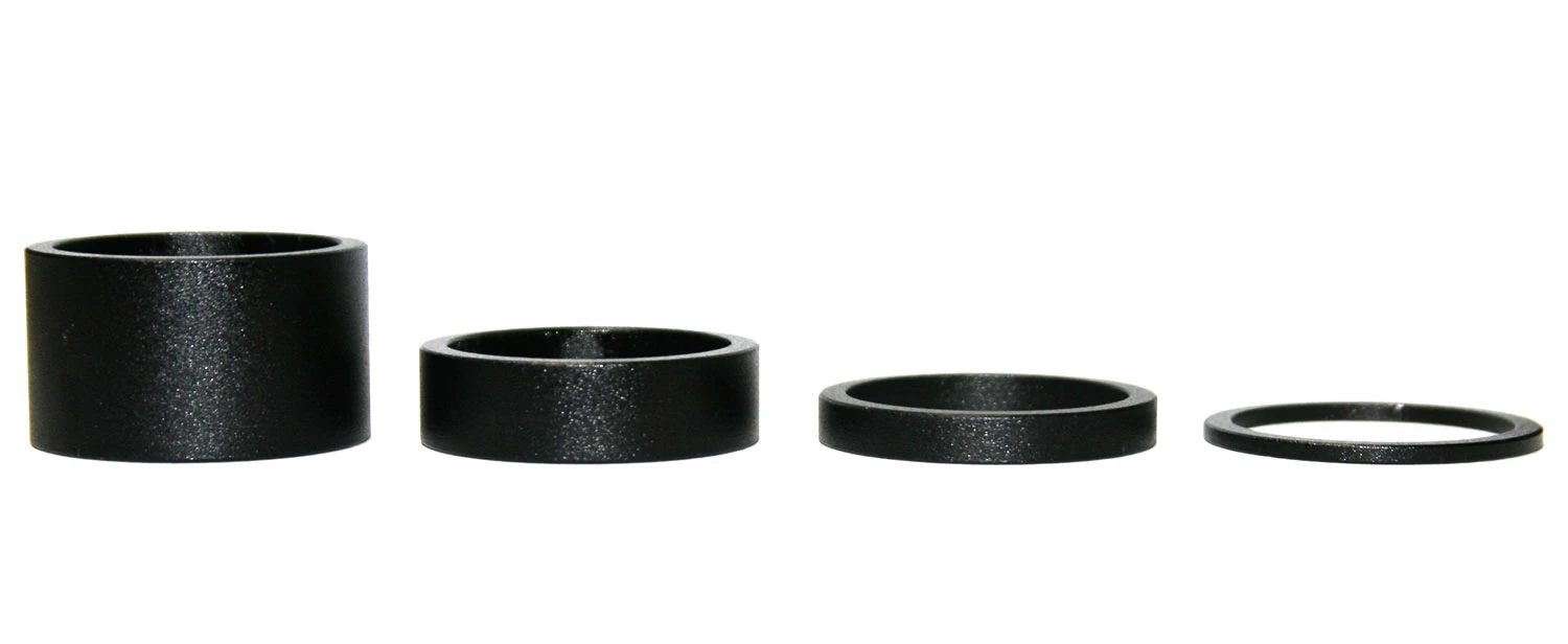 - Pour potences de 1 1/8″. Jeu de quatre pièces de 2 mm, 5 mm, 10 mm et 20 mm. Attention : respecter la longueur minimale d’insertion du pivot de fourche dans la potence